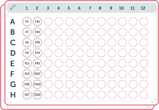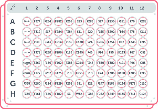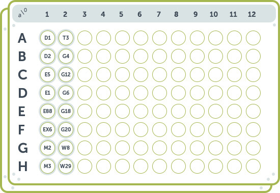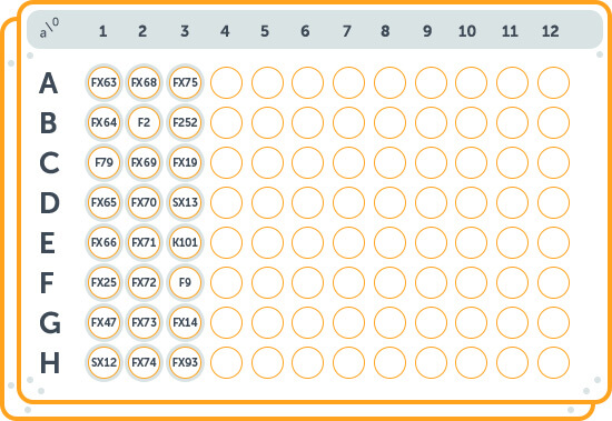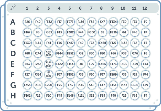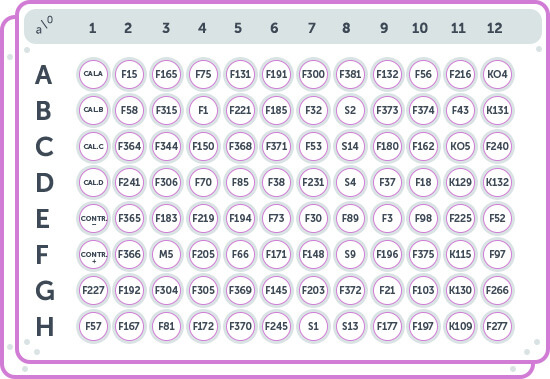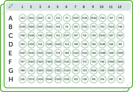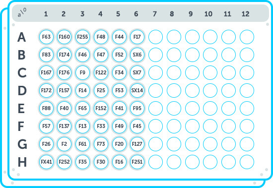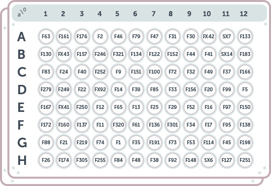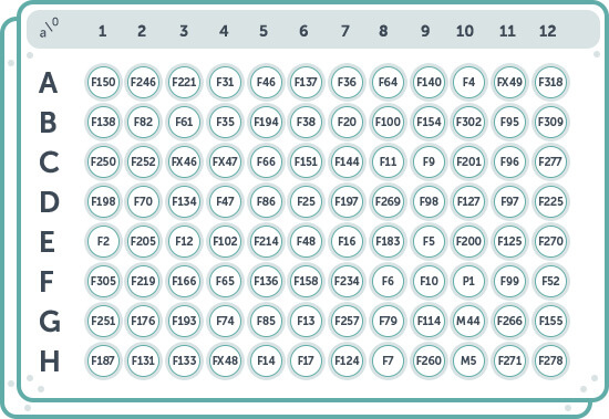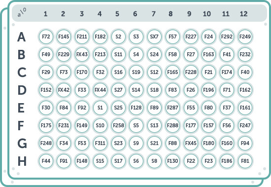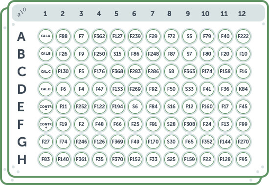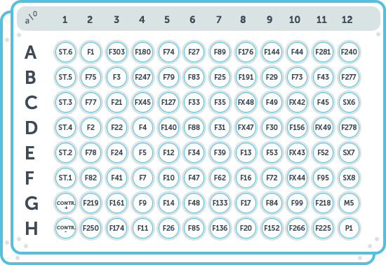 Fx19 Цитрусовые: лимон, апельсин, мандарин, грейпфрут. Fx25 Компоненты молока: альфа-лактальбумин, бета-лактоглобулин, казеин. Fx47 Капуста: капуста белокочанная, краснокочанная, зеленая, савойская. Fx63 Орехи: кунжутные семечки, арахис, фундук, миндаль. Fx64 Лук, чеснок. Fx65 Мясо птицы: мясо утки, гуся, курицы, индейки. Fx66 Ягоды: клубника, малина, смородина, черника. Fx68 Масло: масло из чертополоха (расторопши), подсолнечное, оливковое. Fx69 Дрожжи: пекарские, пивные. Fx70 Бобовые: горох, соя, белая фасоль, чечевица. Fx71 Мясо: свинина, говядина, баранина, крольчатина. Fx72 Кофе, чай. Fx73 Овощи: томат, морковь, картофель, огурец, кабачок цуккини. Fx74 Рыба: форель, лосось, окунь, треска, карп, судак. Fx75 Зерновые: пшеничная, ржаная, гречневая мука, пшеница спельта (полба). Fx93 Молоко: молоко соевое, козье, овечье. Sx12 Перцы: чёрный, зелёный, красный, белый перцы горошком. Sx13 Специи: лавровый лист, укроп, петрушка, корень петрушки.